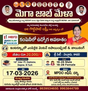 ఈ జాబ్ మేళా 2026 మార్చి 17వ తేదీన నిర్వహించనున్నారు. The Darsi Job Mela will take place at the MPDO office in Darsi. ఇంటర్వ్యూకు వచ్చే అభ్యర్థులు తమతో పాటు బయోడేటా, ఆధార్ కార్డు, మార్కుల మెమోలు, బ్యాంక్ అకౌంట్ వివరాలు, రెండు పాస్పోర్ట్ సైజు ఫోటోలు తీసుకురావాలని సూచించారు.